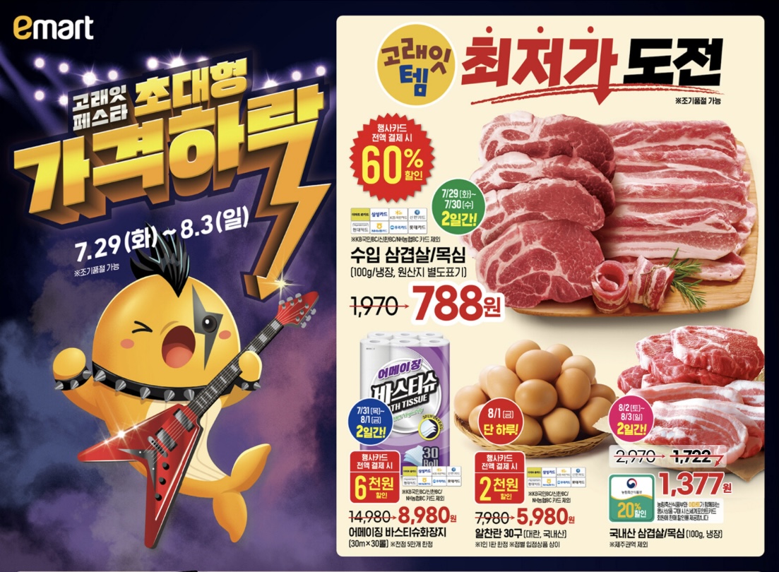 100g 788원 삼겹살, 여름 이불 반값, 간편식은 2개 사면 50% 할인! 지금 이마트 안 가면 진짜 손해예요.